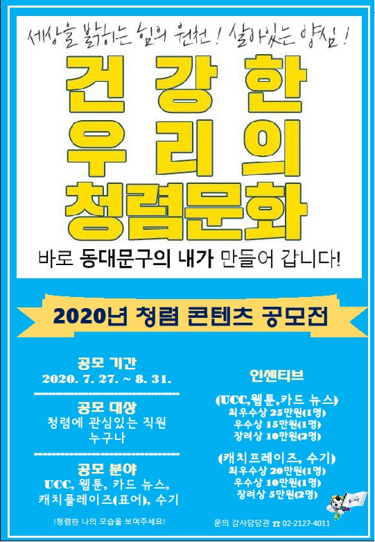 구는 “건강한 우리의 청렴문화, 바로 동대문구의 내가 만들어 갑니다”를 주제로 8월 31일까지 2020년 청렴 콘텐츠 공모전을 개최한다.