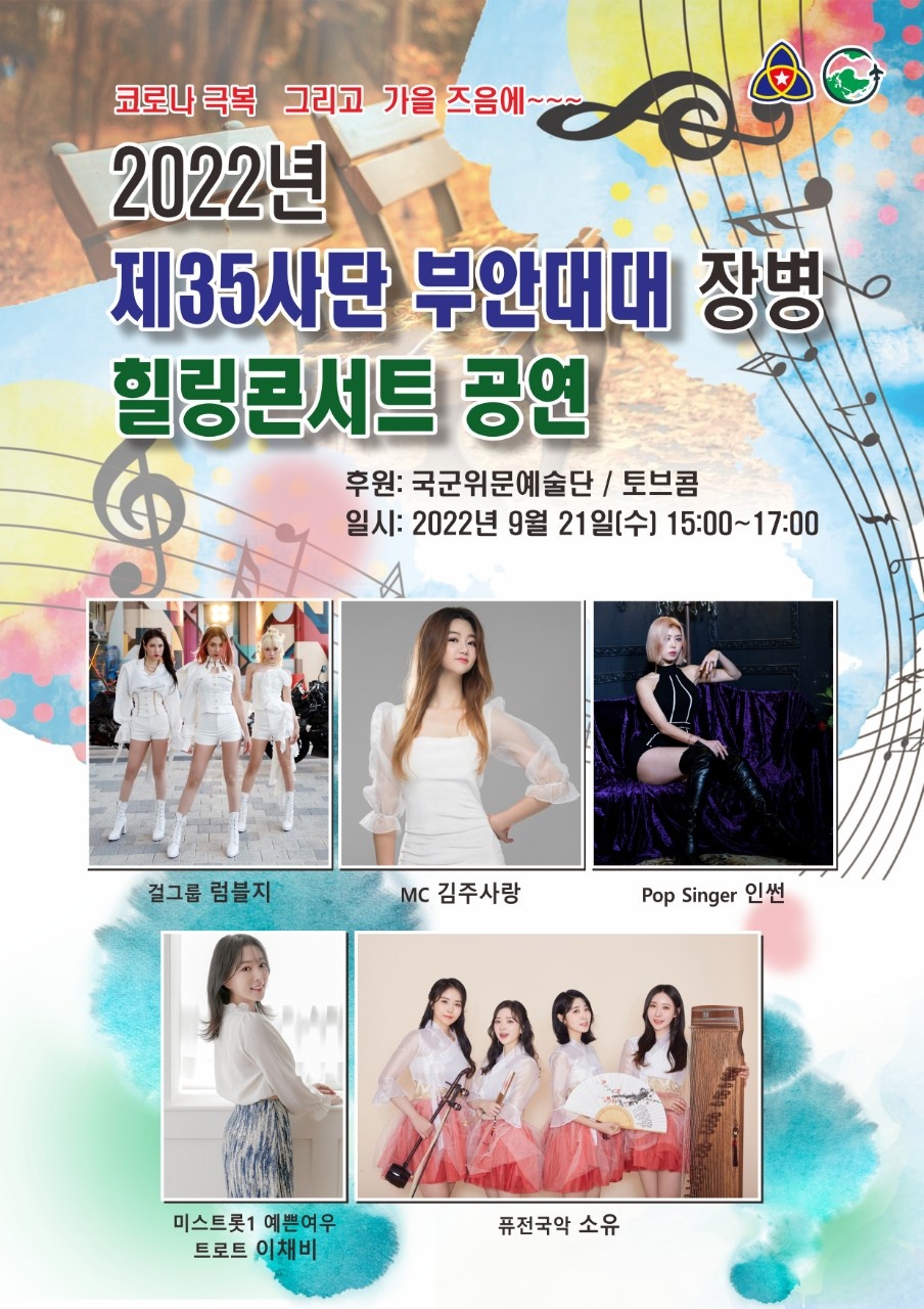 이날 행사에는 MC 김주사랑. 쎄미트롯 이채비, 팝싱어 인썬, 퓨전 국악 걸그룹 소유, k-pop걸그룹 럼블지 와 장병들이 함께 출연했다.