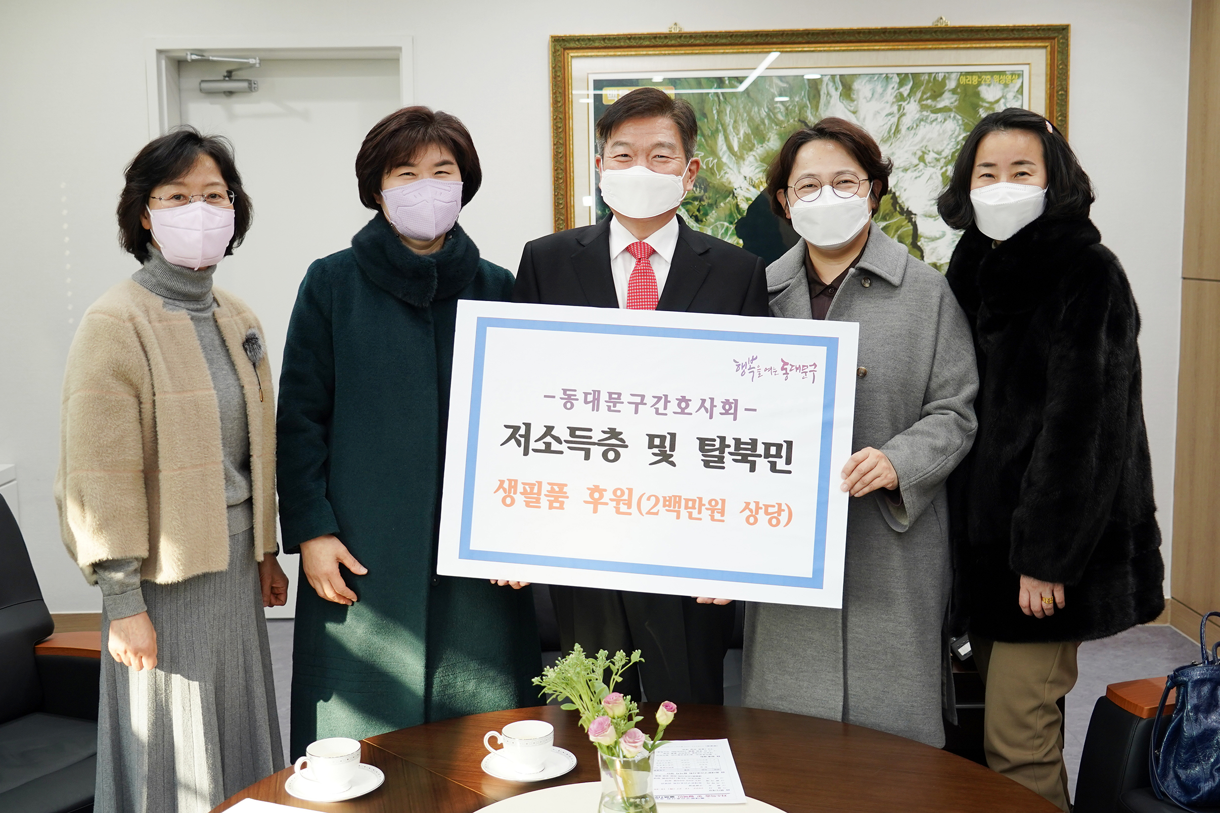 이날 구청 5층 구청장 접견실에서 진행한 기탁식에는 이필형 동대문구청장, 동대문구간호사회 서현기 회장, 최은주 부회장 등 임원진 4명이 참석했다.