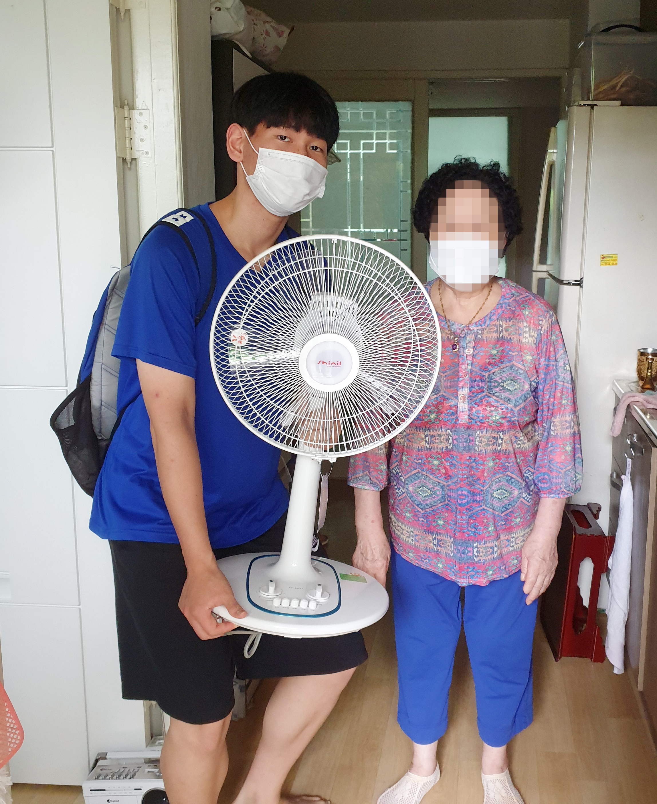 ▲청량고등학교 자원봉사자가 홀몸어르신께 선풍기를 전달했다.