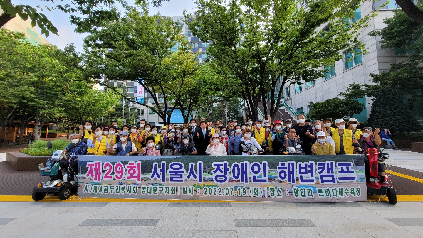 ▲ 7월19일 구청 앞 광장에서 제29회 서울시 장애인 해변캠프 참가를 위해 참석한 케어곰두리 봉사회 동대문구지회 회원들, 이필형 동대문구청장(가운데)과 기념 촬영.