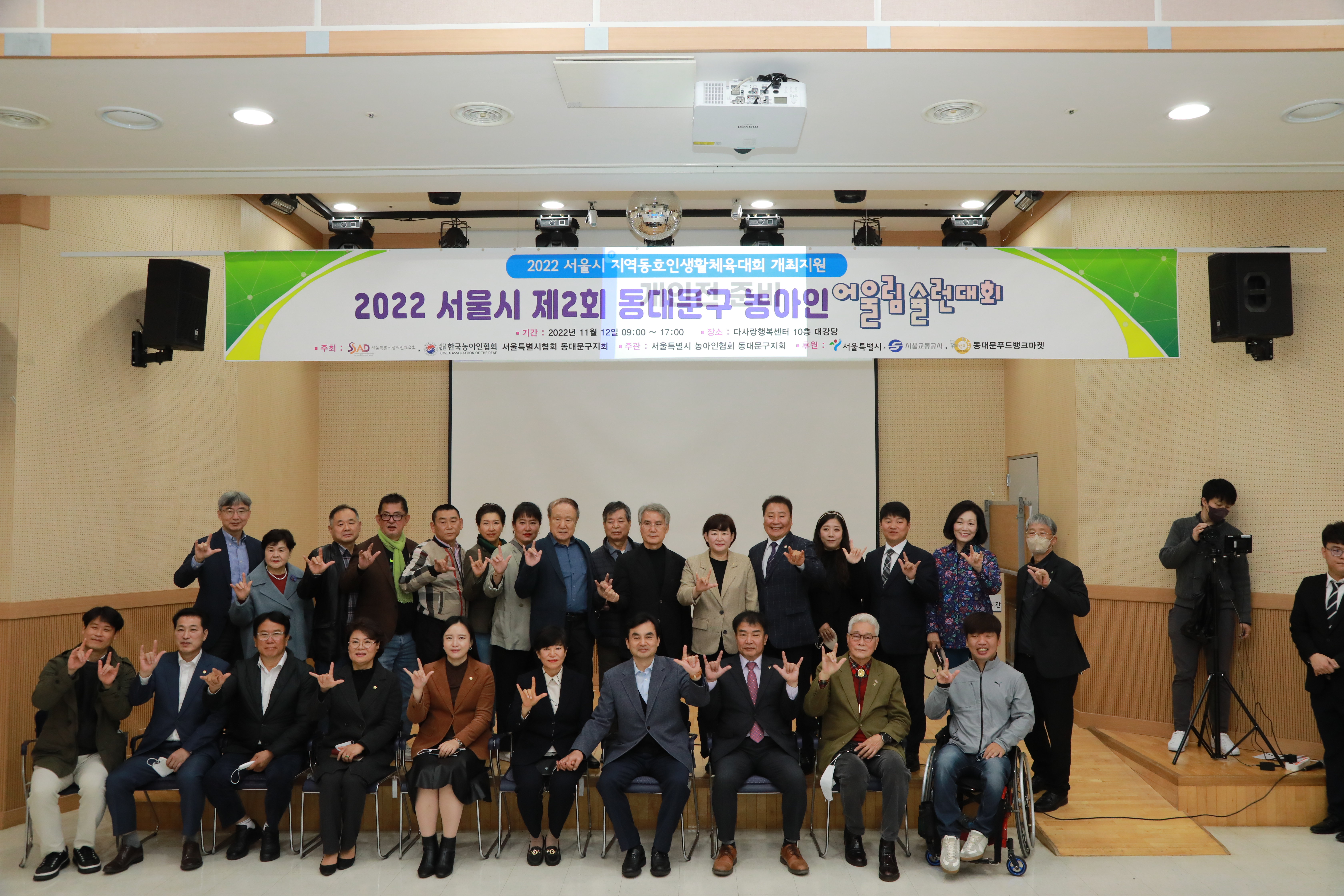 서울특별시농아인협회 동대문구지회(지회장 이양심)는 서울시장애인체육회 지원으로 11월 12일 다사랑행복센터 10층 강당에서 25개 자치구별 농아인 선수 50명과 내빈, 자원봉사자 등 100명이 참석한 가운데 ‘2022년 동대문구 농아인 제2회 어울림 슐런대회’를 개최하여 화합의 장을 마련했다.