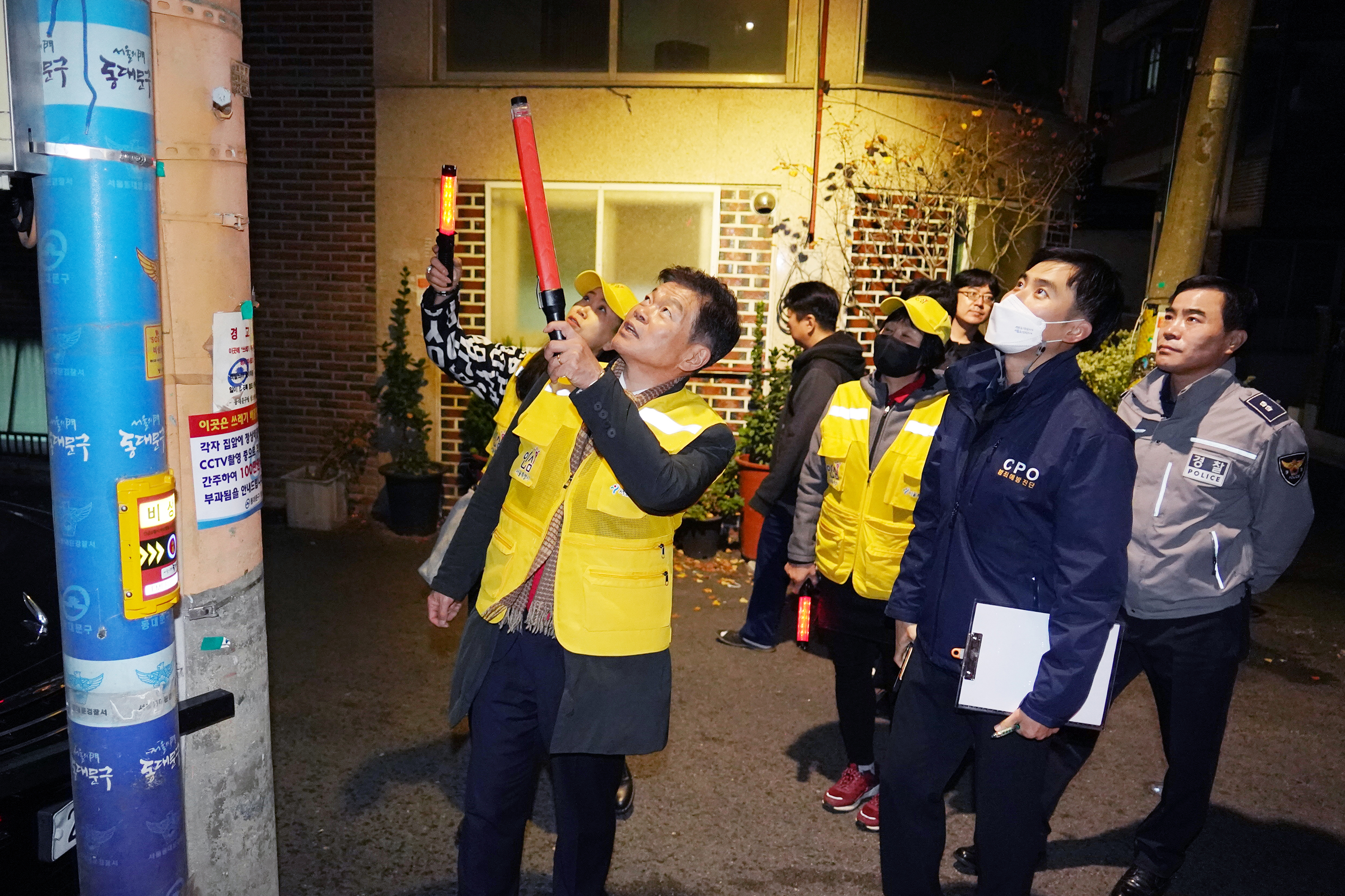 ▲안심귀가 스카우트 대원, 경찰과 합동순찰을 하고 있는 이필형 동대문구청장